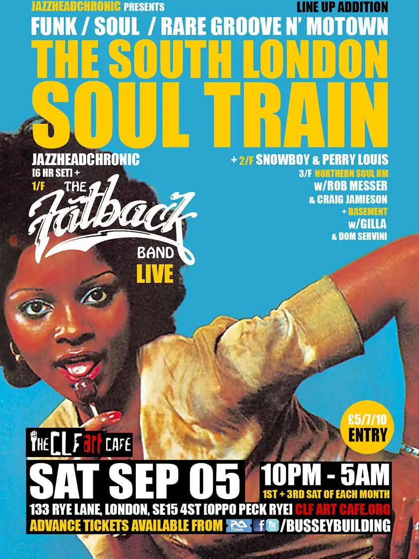 Since It’s Inception in 2011 - The South London Soul Train has earned a reputation as one of worlds leading eclectic soul night. A multi-level funked up extravaganza, The South London Soul Train was founded by Jazzheadchronic Mickey Smith at The 1050 capacity CLF Art Cafe aka Bussey Building, Peckham [which Mickey also founded].